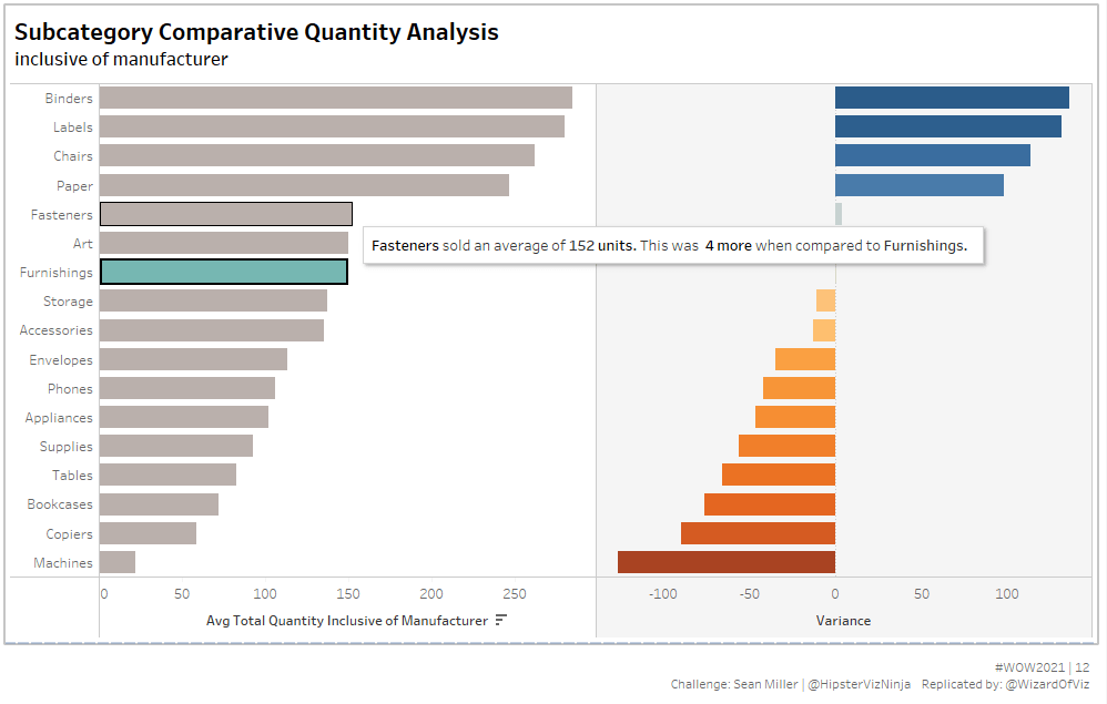 This week’s WorkoutWednesday @HipsterVizNinja challenged us to leave our comfort zone of the FIXED LOD and use INCLUDE to calculate the quantity by manufacturer for each sub-category and show the average. The user must select a subcategory from which a comparison of quantities is derived, with a second axis showing the variance for the selected subcategory vs. all other subcategories.