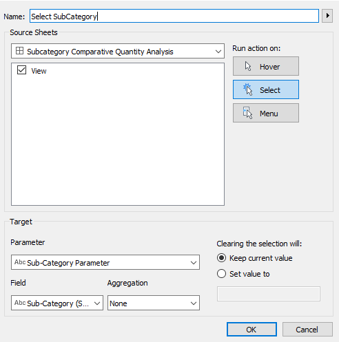 When interacting the visual, the user needs to be able to select a subcategory for comparison. Use the subcategory dimension to create a parameter. Create a boolean calculation comparing the parameter value to the subcategory dimension.