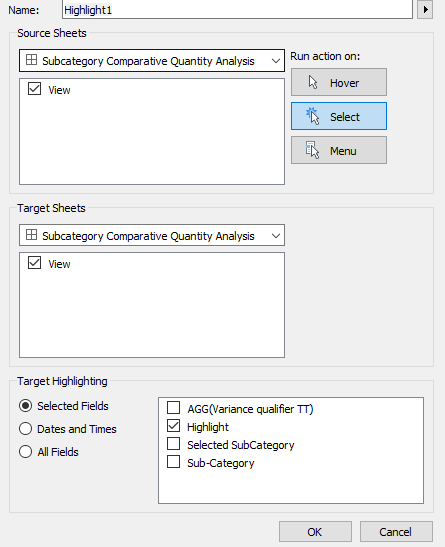 When selecting a subcategory, the bar will be highlighted by default. We can “remove” the highlight by creating a dummy highlight that will highlight all bars, thereby making it look like nothing is being highlighted. Create a field for the dummy highlight. I just set this field equal to ‘1’. Add this new field to detail on the All marks card. Create a highlight action passing through only the highlight field when you select on the view.