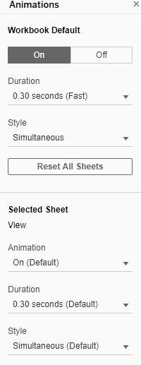 With version 2020.1, Tableau added animations. These animations can be turned on or off for each workbook or each view and animate any changes to the visualizations. To turn on animations, access the animations options from the Format –> Animations menu. From here, you can turn on the default for the entire workbook, the speed of the animations, and the style (either sequential or simultaneous). You can also change the settings for each selected sheet independently.