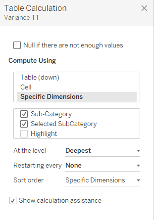 Bring both of these new calculations to the tooltip and create the text to align. Since these calculations are based off Variance, a table calculation, you must also set the scope/direction for these fields. Adjust the compute using to be based off both the Sub-Category and Selected Sub-Category for both of these calculations.